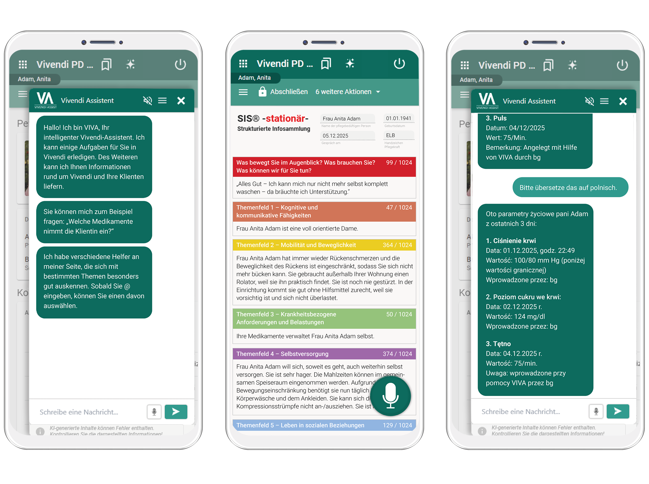 VIVA kann Sie in unterschiedlichen Situationen und in verschiedenen Vivendi-Modulen unterstützen. Mal tritt VIVA sichtbar als KI-Chatbot auf, mal arbeitet der KI-Assistent im Hintergrund – zum Beispiel bei der Sprachdokumentation oder beim schnellen Abruf des Klientenstatus auf Knopfdruck. Zusätzlich kann VIVA Inhalte in über 30 Sprachen übersetzen und damit sprachliche Barrieren in der Pflege reduzieren. VIVA kann Ihnen bei der Tourenplanung helfen und die beste Routen für Sie finden. Auch administrative Aufgaben lassen sich mit VIVA deutlich einfacher erledigen. Zum Beispiel steht VIVA als Support-Assistent jederzeit für Fragen rund um Vivendi und Ihre Klienten zur Verfügung.